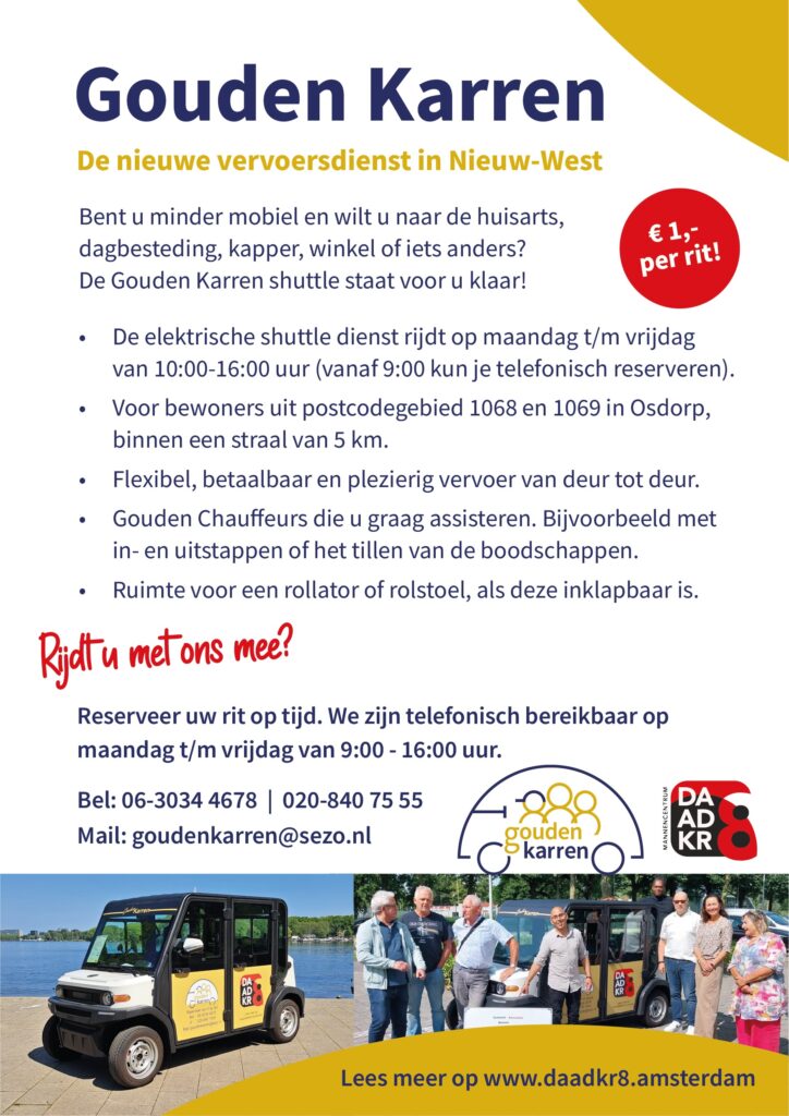 De Gouden Karren is een vervoersdienst in Nieuw West voor iedereen die minder mobiel is. Een rit naar bijvoorbeeld de huisarts, supermarkt of kapper is €1,-. Gouden Karren werkt ook samen met het Buurtteam in de wijk.